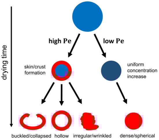 A simplified schematic representation of these two cases is given in Figure 4. In reality, droplets will experience varying values for the number during their lifetime due to changing evaporation rates and diffusion coefficients, complicating the above discussion. Nevertheless, this concept allows for physical interpretation of the effect that different process and formulation factors will have on final particle morphologies in droplet drying processes. In the following section, the influence of various parameters on the droplet drying and particle formation process is discussed in greater detail.