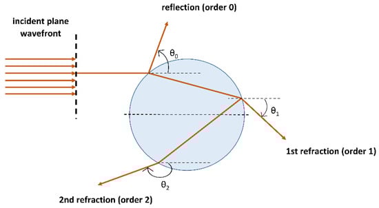Different droplet characteristics, such as their size and their composition, can be measured using optical techniques based on elastic scattering (i.e., rainbow refractometry and PDA) or inelastic scattering (i.e., Raman spectroscopy). The rainbow refractometry technique analyzes the interference patterns created by the interaction of light with a spherical droplet and determines both the droplet diameter and the refractive index (RI). From the RI, information about the temperature and chemical composition can, in some cases, be deducted [74]. This interference pattern is generated by the light rays which experience three interactions with the droplet (order 2 rays in Figure 5) and are parallel to each other.