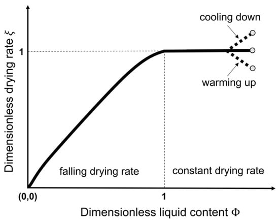 The second stage of drying is defined by the solutes present in the droplet. As solvent evaporation takes place from the surface of the droplet, the solute concentration at the surface increases, and the growing concentration gradient causes a diffusional solute flux away from the droplet surface towards the center of the droplet. The diffusional motion of the dissolved components is a complex phenomenon that needs to be understood correctly to explain the final distribution of the different substances [9]. In this review, the different factors that control this movement will be elaborated for single droplet drying, spray drying and electrospraying. Eventually, the diffusional motion of the solutes towards the center of the droplet becomes lower than the reduction rate of the droplet diameter due to the constant rate solvent loss. At this point, crust formation will occur due to solute enrichment at the droplet surface, leading to decreased drying rate and introducing the second drying stage [1]. This point is referred to as the critical point or locking point. At the start of the second drying stage, a porous solid crust and an internal wet core can be distinguished in the drying droplet. The drying rate is now controlled by the diffusion or capillary flow rate of the solvent from the wet core through (the pores of) the crust. The slowed solvent evaporation still results in shrinkage of the wet core and substantial growth of the crust towards the center of the droplet [1,11]. The thickening of the crust will lead to an increasing resistance for mass transfer and thereby a gradual reduction of the drying rate. Hence, this second stage is named the falling-rate stage of drying. During this stage, the droplet’s surface temperature will increase until the dry-bulb temperature (i.e., temperature of the surrounding gas) is reached and a non-evaporating solid sphere is developed [7]. This implies that a particle with the lowest possible amount of residual solvent is present, which can either be an equilibrium amount or residual solvent that cannot be removed by the drying process. In some cases, a clear subdivision of the falling-rate period based on the degree of drying rate decrease can be observed: a first stage, where unsaturated surface drying occurs, and a second stage, where the diffusion of fluid from the center of the droplet towards the surface is the rate limiting factor [12]. Hence, the drying rate over time in the falling-rate period can take on different shapes depending on the system and the drying conditions. The general two-stage droplet drying process is depicted in Figure 1 [11,13].