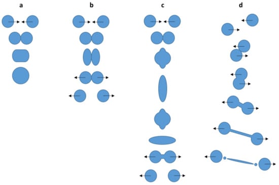 An increased diffusivity can be obtained by reducing the size of the components. During evaporation, substances with a higher diffusion coefficient move from the air–liquid interface to the center, whilst substances with a lower diffusion coefficient mostly stay at the interface [67]. It becomes less trivial when similar diffusivities are present or when multicomponent systems are used, for example with the addition of surfactants or extra solutes [65,66,68]. A solution that consists of two components of similar size can result in a particle with well-distributed components because of similar diffusion velocity [2]. If components with different sizes are dissolved, the situation is different. In this case, the component with lower diffusivity (i.e., the larger component, as can be derived from Equation (3)) occupies the surface, while the center mainly consists of the smaller, high diffusivity substance [69]. Regarding the final particle morphology, an early skin formation can be observed when the dissolved solids are characterized by a low diffusivity. As mentioned before, this early skin formation can result in hollow, collapsed, porous, or wrinkled particles, depending on the mechanical strength of the crust and thus on the properties of the solutes. For compounds with a high diffusion coefficient, more rigid, dense, stable, and compact particles are obtained since the solute particles are able to diffuse inwards within the droplet, thereby keeping the component distribution homogeneous [9,14,61].