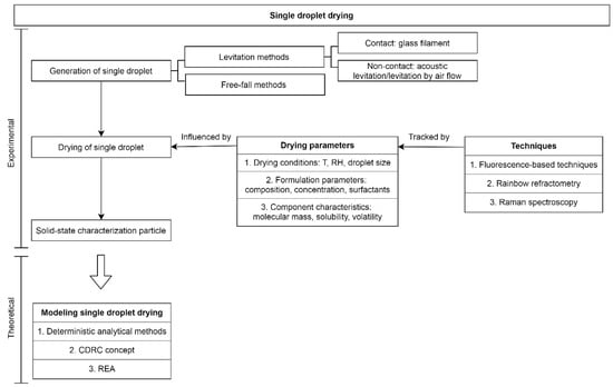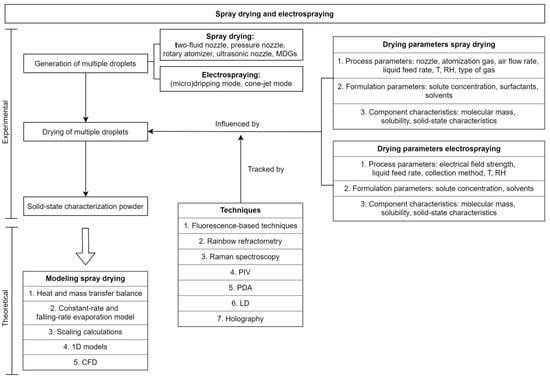 The focus of this work lies on a deeper understanding of this drying process to facilitate particle engineering. Hence, all aspects of the droplet drying process are described. Although excellent reviews exist for different features, there is, to the best of our knowledge, no single review that describes all steps that one should consider when trying to engineer a certain type of particle morphology. Techniques to create single droplets, as well as parameters that can influence the drying process and visualization techniques to characterize the changes during drying are discussed. With a view to pharmaceutical applications, the predictive power of single droplet drying for spray drying and electrospraying processes is described. Next to that, techniques to create sprays and their influence on droplet size distributions can be found. This review also comprises models for the simulation of both single droplet drying and spray drying. It should be pointed out that this work focuses on free solution droplets, meaning that there is no interference of solvent evaporation by a substrate and that a common solvent for all compounds is required. There is a lot of literature available on drying of droplets on diverse surfaces and on the drying behavior of dispersions and suspensions. Although these drying mechanisms are even more complex than that of free solution droplets, this review can also be employed as a starting point for gaining insight in their drying behavior. In addition, the combination of low molecular weight drugs and polymer systems are highlighted because of their widespread use in pharmaceutical industry. Articles concerning other types of dissolved substances were only included in case the conclusions or outcomes are believed to be generalizable towards pharmaceutical drying processes.