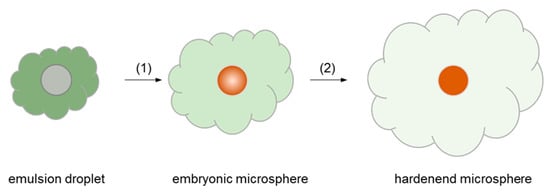 Pictorial representations of our essential microencapsulation approach. Step (1) is carried out to produce embryonic, semisolid microspheres. Step (2) stands for the primary solvent extraction process for microsphere hardening. The color gradient represents the difference in the aqueous ethyl formate concentration during microencapsulation. The fading intensity indicates that an aqueous ethyl formate concentration is being diluted, as the system is quenched with water.