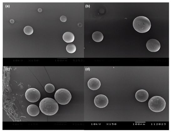 When encapsulated into PLGA microspheres through our microencapsulation technique, progesterone was almost wholly loaded into PLGA microspheres (Figure 2). For example, when initial progesterone payloads were 40 and 130 mg, the corresponding drug EE values were 94.9 ± 4.0 and 95.8 ± 1.3%, respectively. Our EE results are far better than those previously reported by other research groups. In many cases of solvent evaporation processes using methylene chloride, unentrapped hydrophobic drug crystals tend to appear in microsphere suspensions. As a result, low encapsulation efficiencies are often observed. For example, when encapsulating risperidone in PLGA microspheres, its EE was as low as 14.4% []. In cases of cyclosporine A and norquetiapine, their EE values were 57.5 ± 3.0% and 48.3 ± 3.0%, respectively [,]. There are also a couple of studies encapsulating progesterone into PLGA microspheres via methylene chloride-based solvent evaporation methods [,]. Its EE values ranged from 78.2 to 84.6%. In our solvent evaporation process using methylene chloride, progesterone EE was determined to be 64.6 ± 2.6%. As mentioned above, the formation of unentrapped progesterone crystals was mainly attributed to the relatively low drug encapsulation. In comparison to those studies, the ethyl formate-based microsphere manufacturing process brought up excellent drug EE. As shown in Figure 3, the microspheres had spherical morphology, and no progesterone crystals were present on their non-porous and smooth surface. Figure S1 shows a typical size distribution of progesterone-containing PLGA microspheres. The morphology of PLGA microspheres prepared by solvent evaporation was also demonstrated in Figure S2.