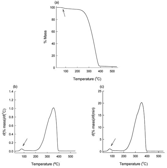 Many TG studies qualitatively evaluate drugs in polymeric matrices. For example, Hasseb et al. carried out a TG experiment to demonstrate the presence of chlorhexidine in poly(ethylene glycol)–block–poly(L-lactide) nanoparticles []. A TG curve of chlorhexidine-loaded nanoparticles was compared with individual TG curves of chlorhexidine and the copolymer. Elaborating on differences in their mass change profiles, they concluded that chlorhexidine was incorporated into the polymeric nanoparticles. A similar approach was used to assert the encapsulation of ormeloxifine and quercetin in PLGA nanoparticles [,]. In fact, their TG curves demonstrated that mass loss occurred between 50 and 100 °C, and slow weight loss continued afterward. However, there was no mention of their causes for such weight loss profiles.