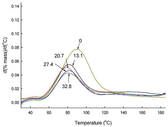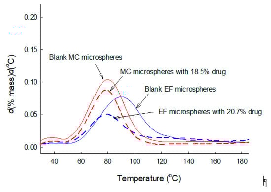 Figure 4 shows typical TG and DTG curves of a microsphere batch manufactured using ethyl formate. The TG curve illustrated that there was very little weight loss of microspheres below 200 °C, and the mass loss arising from the evolvement of ethyl formate was not sharply outlined (Figure 4a). On the contrary, its DTG curves displayed a clear peak indicative of the volatilization of residual ethyl formate in PLGA microspheres (Figure 4b,c). Figure 4 proves that DTG allows recognizing the thermal event of solvent evolvement more clearly than TG does. Moreover, DTG makes it easier to identify the temperatures at which the solvent volatilization begins and ends. Figure 5 illustrates portions of DTG curves of PLGA microspheres with various amounts of progesterone over the temperature range of 30 to 185 °C. Distinct peaks arising from the evolvement of ethyl formate from different microspheres appear clearly.