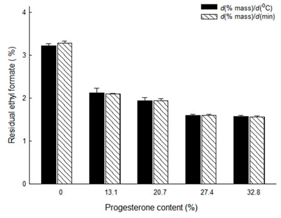 Amounts of residual ethyl formate in PLGA microspheres with different progesterone payloads. The first derivatives of a TG curve with respect to degrees Celsius and minutes were employed to calculate the content of residual ethyl formate.
