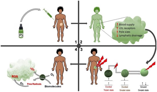 For any therapeutic option, the main themes to evaluate are the pharmacokinetic and pharmacodynamic factors, which are utterly vital in determining the therapeutic outcome. The distinctiveness of PDT with other therapies lies in its high selectivity for tumor cells. The two nontoxic components, the PS and light, can produce cytotoxicity after a physical interaction at the site of the tumor. The PS selectively localizes in tumors and tumor vasculature due to many characteristics of the tumor (Figure 1) and stays inside the cancer cells until light is irradiated onto the tumor. The activating light is then focused onto the tumor area to activate the absorbed PS detonating an added level of selectivity where the rest of the body tissues are not affected. The light is of an appropriate wavelength and energy, usually laser, although other light sources, e.g., polychromatic light can be used for other cancers, especially those affecting the superficial layers of the body [17]. Though the PS and light are the essential components in PDT, there is a third component necessary for PDT to occur, i.e., the inherent molecular oxygen present in the tissue extracellular and intracellular spaces, which is readily available to be a substrate for the activated PS to form ROS. Depending on the cancer, the PS can be administered locally or systemically via injections. At the PS administration stage, there is a high level of tumor selectivity due to various factors including the high tumor vasculature that increases the surface area for PS entry in cancer tissue than normal tissue; The increased membrane permeability of cancer cells other than normal cells due to overexpression of low-density lipoprotein (LDL) membrane receptors; and also the decreased lymphatic drainage of tumor tissue [18]. All these characteristics of cancer tissue increase their affinity for PS entry alongside the specific and focused application of light only at the tumor site (Figure 1).