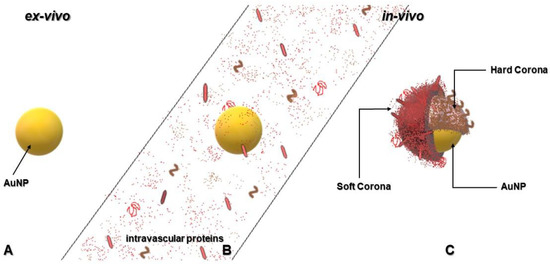 Formation of protein corona in blood plasma when NPs are injected into the blood circulation system during therapy. (A). AuNPs in their original form before administration (B). AuNPs in the vascular system exposed to intravascular proteins (C). AuNPs coated with proteins and protein fragments, which renders the AuNP unrecognizable at the target site.