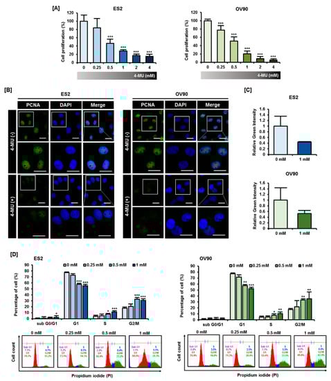 Effects of 4-methylumbelliferone (4-MU) on ES2 and OV90 cell proliferation. (A) A BrdU cell proliferation assay was performed to measure the anti-proliferative effects of 4-MU (0, 0.25, 0.5, 1, 2, 4 mM) on ES2 and OV90 cells. Cell proliferation in the 4-MU-treated group was calculated as a percentage relative to that in the vehicle-treated group; (B) PCNA localization (green) in the nucleus was detected by confocal laser microscopy and 4′,6-diamidino-2-phenylindole (DAPI, blue) counterstaining was used to visualize the nuclei. Scale bar, 20 µm; (C) Green fluorescence intensity was quantified using ImageJ and comparative green intensity of 4-MU treated groups was represented as compare with vehicle-treated groups; (D) The effect of 4-MU on cell cycle progression was determined using propidium iodide (PI) staining and flow cytometry in ES2 and OV90 cells. The percentage of cells in each phase was calculated based on the total cell population.