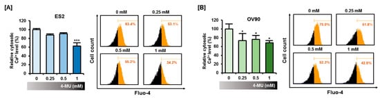 Effects of 4-MU on cytoplasmic calcium concentration in ES2 (A) and OV90 (B) cells. Cytoplasmic calcium concentration was measured by flow cytometry using Fluo-4 AM and data were quantified relative to the calcium level of the vehicle-treated group. Each experiment was performed in biological triplicates. Flow cytometry histograms from one of the three experiments are presented. * p < 0.05 and *** p < 0.001, for vehicle-treated vs. 4-MU-treated groups.