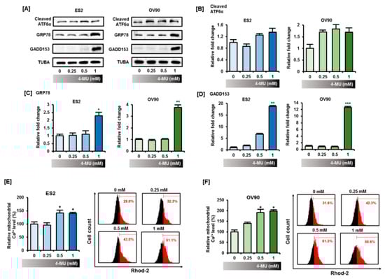 Next, we investigated the effects of 4-MU on ER stress by analyzing the expression levels of the ER stress-related proteins cleaved activating transcription factor 6α (ATF6α), 78-kDa glucose-regulated protein (GRP78), and growth arrest- and DNA damage-inducible protein 153 (GADD153). As shown in Figure 3A, ER stress protein expression levels in the ES2 and OV90 cells were significantly increased by 4-MU treatment. The increase in cleaved ATF6α levels was not dose-dependent, but they were slightly elevated after 4-MU treatment (Figure 3B). The expression levels of GRP78 and GADD153 after treatment with 1 mM 4-MU showed a great increase as compared with those in untreated cells (Figure 3C,D). Since the ER is closely associated with the maintenance of mitochondrial calcium homeostasis, we stained ES2 and OV90 cells with the mitochondrial calcium indicator Rhod-2 AM. As shown in Figure 3E,F, the mitochondrial calcium concentration ([Ca2+]mt) significantly increased (p < 0.05) in ES2 cells after treatment with 4-MU. After treating OV90 cells with 1 mM 4-MU, [Ca2+]mt almost doubled as compared with [Ca2+]mt in the vehicle-treated cells (p < 0.05). Taken together, these results indicated that 4-MU treatment disrupted organelle homeostasis, specifically increasing ER stress and mitochondrial calcium levels.