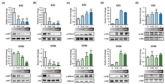 Regulation of PI3K/AKT and MAPK signaling by 4-MU. Phosphorylation levels of AKT (A), S6 (B), ERK1/2 (C), P38 (D), and JNK (E) were determined by Western blot analyses after 4-MU treatment. The relative intensity was averaged over three independent experiments and was normalized to the total protein levels. * p < 0.05, ** p < 0.01, and *** p < 0.001, for untreated vs. 4-MU treated groups.
