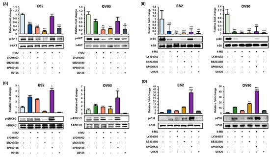 Pretreatment with pharmacological inhibitors before 4-MU treatment alters the phosphorylation of signaling proteins. Phosphorylation levels of AKT (A), S6 (B), ERK1/2 (C), and P38 (D) in ES2 and OV90 cells were measured by Western blot analyses. The relative intensity of the bands of each protein was normalized to the total protein levels and was averaged over three independent experiments. * p < 0.05, ** p < 0.01, and *** p < 0.001, for untreated vs. 4-MU treated groups.
