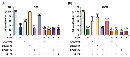 Effects of the co-treatment with 4-MU and pharmacological inhibitors on human ovarian cancer cells. Cells were incubated with 20 μM LY294002, SB203580, or SP600125 or 10 μM U0126, with or without 4-MU (1 mM). Cell proliferation assays were performed as previously described for ES2 (A) and OV90 (B) cells. ** p < 0.01 and *** p < 0.001, for vehicle-treated vs. and 4-MU treated groups. Each letter indicates significant differences between the inhibitor with or without 4-MU. a, significant difference between LY294002 treatment alone and combined 4-MU/LY294002 treatment; b, significant difference between SB203580 treatment alone and combined 4-MU/SB203580 treatment; c, significant difference between U0126 treatment alone and combined 4-MU/U0126 treatment; d, significant difference between SP600125 treatment alone and combined 4-MU/SP600125 treatment.
