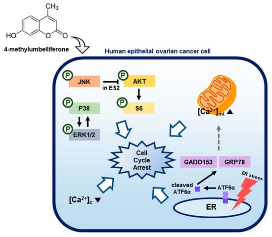 The intracellular mechanisms responsible for the downregulation of epithelial ovarian cancer cell proliferation by 4-MU are unknown. We demonstrated that 4-MU reduced the proliferation of epithelial ovarian cancer cells (ES2 and OV90) by inducing G2/M phase arrest. Moreover, 4-MU affected intracellular calcium levels, ER homeostasis, and PI3K/AKT and MAPK signaling pathways. The combination of 4-MU and pharmacological inhibitors effectively suppressed cancer cell proliferation. The effects of 4-MU on ES2 and OV90 cells are summarized in Figure 7.