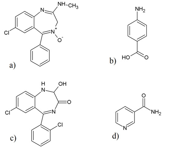 - Fischer, A. Chlordiazepoxide dichloro-methane monosolvate. Acta Crystallogr. Sect. E Struct. Rep. Online 2012, E68. [Google Scholar] [CrossRef]