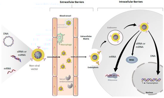 Naked genetic material molecules, besides not having the ability to target specific cells and be internalized by them, are not able to successfully reach a target tissue before being degraded by serum endonucleases [2,4]. Thus, a crucial factor in determining the success of gene therapy is the development of safe and efficient gene delivery systems capable of protecting the genetic material and overcoming the critical physiological barriers to gene delivery (Figure 1), while increasing the transfection efficiency and specificity [4,5]. Ideally, these carriers should introduce targeted gene delivery properties with controlled release kinetics, to reduce the undesired off-site effects, and thus improve the effectiveness of the treatment [1,2,6].