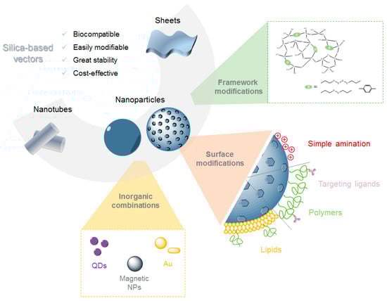 This review covers the different types of silica-based structures (Figure 2) that have been recently reported for gene delivery applications, such as silica nanotubes, silica sheets, and a variety of nanoparticles-based systems, including their main properties, fabrication methods, surface modifications, and potential therapeutic applications.