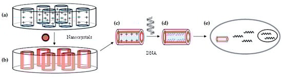 Despite their advantages, the use of SNTs as gene carriers is still quite rare and not heavily reported. In 2005, Chen and co-workers were the first to introduce SNTs as a gene delivery system [22]. They synthesized fluorescent silica nanotubes through a sol–gel reaction by incorporating CdSe/ZnS nanocrystals and using an alumina membrane as a template (Figure 4). Afterward, the inner surface of the nanotubes was functionalized with APTMS, creating a cationic surface capable of efficiently condense and load DNA. According to confocal microscopy results, 60 to 70% of cultured mammalian cells (COS-7) internalized the nanotubes during incubation, which also proved to be non-cytotoxic. Moreover, the SNT/DNA complexes successfully transfected 10–20% of the treated cells, opposite to the absence of transfection registered with the free DNA. In this work, due to the concomitant observation of plasmid DNA (pDNA) and nanotubes inside the cells, the plasmid delivery was suggested to be mediated by the nanotubes, which proved to act as a physical shield, preventing the genetic material degradation.