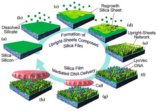 Illustrative scheme of the formation steps of an upright network of silica sheets (a–e), and film mediated DNA transfection to the cell (f–h) (reproduced from [30] with permission from The Royal Society of Chemistry).