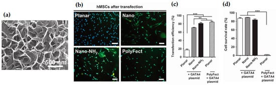 (a) SEM image of the silica upright nanosheet network; Fluorescent images (b) and the corresponding transfection efficiency (c) of human mesenchymal stem cells (hMSCs) after transfection with GATA4 plasmid on a planar silica surface (Planar), unmodified nanosheets (Nano), amino-modified nanosheets (Nano-NH2) and with the transfection agent PolyFect on the planar surface (Polyfect) (the scale bar represents 50 μm); (d) Cell survival rate of hMSCs, determined by flow cytometry, at 60 h post seeding (and 84 h in the Polyfect group). Reproduced from [31], with permission from Springer Nature.