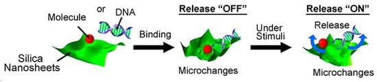 Graphic illustration of the encapsulation and stimuli-responsive release of biomolecules by silica nanosheets. Adapted with permission from [32]. Copyright (2017) American Chemical Society.