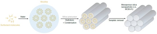 Generally, MSNs are synthesized through modified Stöber processes, which encompass the addition of pore templating agents, such as surfactants or polymers. Typically, the surfactant is stirred in a mixture of water and alcohol, under basic conditions, and if its concentration is above the critical micelle concentration, it self-assembles into micelles that will work as pore templates. As illustrated in Figure 8, when the silica precursor is added to the solution, it condensates at the surface of the existing micelles, forming a silica structure around them. To complete the process, the surfactant micelles are removed from the silica structure through high-temperature processing (calcination) or by solvent extraction. Using this method, the obtained pore size is usually very uniform and easily tunable by varying the type of surfactant used, but it commonly ranges between 2 and 5 nm [8,11,18].