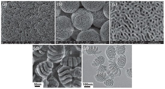 Mesoporous silica nanospheres with tunable pore structure. SEM images of large-pore mesoporous silica nanoparticles in different magnifications: (a) 24,000×; (b) 150,000× and (c) 400, 000×; and flower-like mesoporous nanoparticles obtained with less surfactant: (d) SEM image; (e) TEM image. Adapted from [55], with permission from John Wiley and Sons.