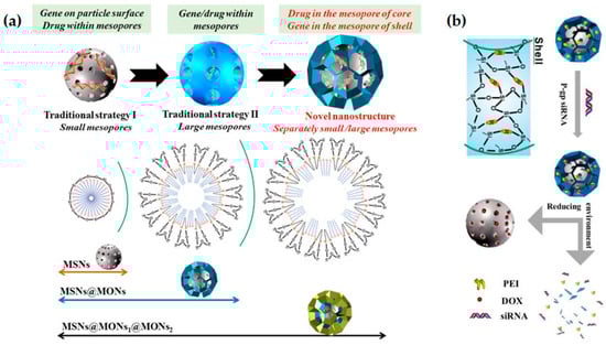 (a) Schematic illustration of the structural evolution and formation mechanism of MSNs from small to large pore-sized MSNs, and core-shell hierarchical MSNs (with small and large pores for drug and gene co-delivery); (b) Breaking-up of the mesoporous organosilica shell of the nanoparticles under reductive environment and consequent siRNA and DOX release. Adapted from [58], with permission from Elsevier.