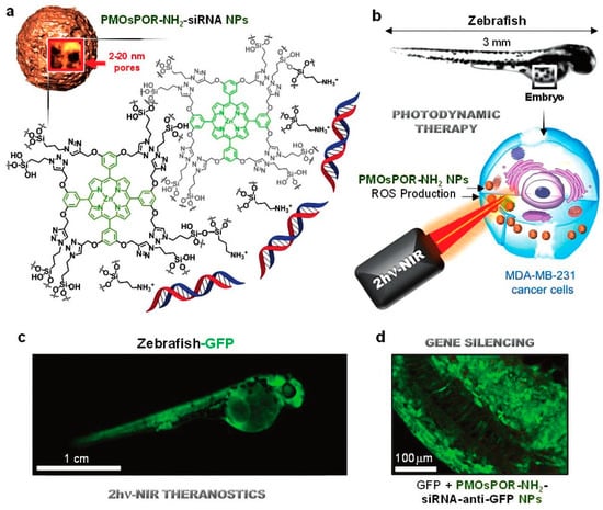 (a) Amine functionalized porphyrin-based mesoporous organosilica nanoparticles (PMOsPOR-NH2) for siRNA binding; (b) Two-photon excited near-infrared (TPE-NIR) photodynamic therapy on zebrafish via PMOsPOR-NH2; (c) TPE-NIR gene silencing on zebra fish-GFP via PMOsPOR-NH2-siRNA; (d) Bioimaging of zebrafish embryos after gene silencing. Reproduced from [61], with permission from John Wiley and Sons.