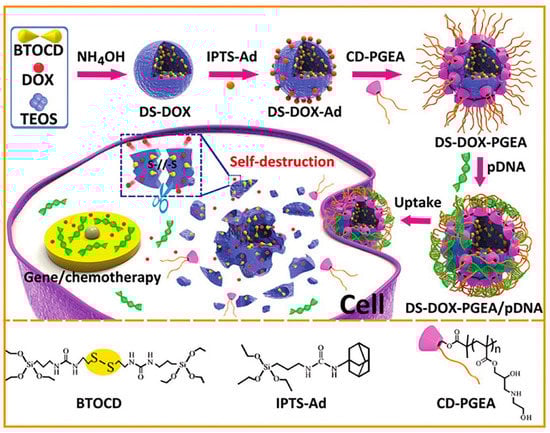 A drug and gene co-delivery system was developed by Zhang and colleagues combining disulfide-bridged and doxorubicin (DOX)-embedded silica nanoparticles with a polycation coating comprising one β-cyclodextrin core and two ethanolamine-functionalized poly(glycidyl methacrylate) arms (Figure 12) [60]. The embedded DOX facilitated the degradation of the silica nanoparticles framework due to the weak silica condensation which, interestingly, resulted in enhanced release and simultaneous delivery of DOX and pDNA encoding p53 after cellular uptake. This co-delivery presented synergistic effects, not only in vitro but also in C6 glioma tumor-bearing mice [60]. Wang’s group also developed a redox-responsive co-delivery system for DOX and p53 gene [76]. Nonetheless, in this work, a chitosan derivative—poly(amidoamine) (PAMAM) dendrimer (G2) conjugated to chitosan—was grafted on the MSNs’ surface via a disulfide linker, acting simultaneously as a “gatekeeper” for the controlled release of DOX and as a complexation and protection site for pDNA. After cellular internalization (under a glutathione-rich environment), the polymer shell was shed, leading to the accelerated release of DOX and nucleic acids. The developed nanosystem presented good biocompatibility and high gene transfection efficiency. The co-delivery of p53 DNA and DOX also revealed synergistic effects and induced significant apoptosis in HeLa cells [76]. Also different synthetic and pH-responsive polymers, such as poly(β-amino ester) [53] or poly(glycidyl methacrylate)-b-poly(2-(dimethylamino)ethyl methacrylate) (PGMA-b-PDMAEMA) [88] have recently been reported as successful choices in the development of MSN-based nanosystems for co-delivery of chemotherapeutic drugs and nucleic acids.