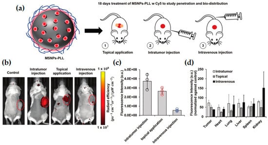 Biodistribution studies of Cy5-marked PLL-coated MSNs: (a) Illustration of the administration routes tested for in vivo studies in squamous cell carcinoma (SCC) mice xenograft model; (b) Representative IVIS images of mice treated with Cy5-marked PLL-MSNs; (c) Fluorescence quantification of IVIS images; (d) Intensity of fluorescence of isolated tumor and major organs after 18-day treatment. Adapted from [78], with permission from Royal Society of Chemistry.