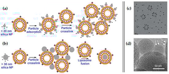 Illustrative representation of the interaction between silica nanoparticles and cationic liposomes (a,b), and TEM images (c,d) of the respective results: (a) Small silica NPs are adsorbed onto the liposomes, resulting in a negatively charged surface. (b) Larger silica NPs lead to the formation of supported bilayers with a positively charged surface, which are useful for DNA binding. (c) TEM image of 10–20 nm silica NPs prepared with 1,2-dimyristoyl-sn-glycero-3-phosphocholine (DMPC) small unilamellar vesicles. (d) Cryogenic TEM image of the protocell, showing the mesoporous silica nanoparticle core and the SLB (white arrows). ((a,b) adapted from [104] with permission from Royal Society of Chemistry; (c) Adapted from [107] with permission from American Chemical Society; (d) adapted from [108] with permission from Elsevier).