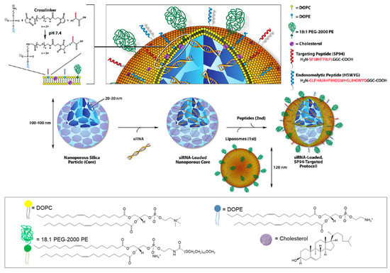 On the matter of developing lipid-coated MSNs for gene delivery, Brinker’s group was a pioneer [104,105,106]. They tested the interaction of silica NPs with cationic liposomes and DNA and found that if the NPs are too small (<20 nm), they end up adsorbed onto the positively charged liposomes, which form very large aggregates, hindering DNA binding (Figure 14a,c) [107]. On the other hand, larger silica NPs (30–130 nm) resulted in the formation of NP-supported lipid bilayers (SLB), with positive surface charges, and thus able to successfully bind the negatively charged DNA (Figure 14b) [104]. Moreover, by fusing liposomes to high-surface-area MSNs and further modifying the resulting SLBs with a targeting peptide, a fusogenic peptide, and PEG, this research group developed a new nanocarrier construct referred to as “protocell” (Figure 14d). Compared to the traditional liposomes, this nanosystem has demonstrated greater bio-applicability, since it is able to encapsulate a variety of different cargos [105]. Ashley and colleagues developed amine-functionalized MSNs with large pores (23–30 nm) that were able to load about 1 nmol of siRNA per 1010 particles [106]. After coating with a cationic (1,2-dioleoyl-3-trimethylammonium-propane (DOTAP))- or zwitterionic (1,2-dioleoyl-sn-glycero-3-phosphocholine (DOPC))-based lipid shell, the loading ability of the nanosystems was not impaired. On the contrary, the resulting SLB had a loading capacity 10–100 times higher than that of the corresponding liposomes. Furthermore, a targeting peptide that binds to HCC (SP94) and an endosomolytic peptide (H5WYG) that promotes endosomal/lysosomal escape were added to the surface of these protocells, as illustrated in Figure 15. In vitro studies have revealed that the nanosystem loaded with an equimolar mixture of siRNAs targeting cyclin A2, B1, D1 and E was able to silence each of the target proteins expression by nearly 90% in 72 h, presenting remarkably low IC90 values for Hep3B cells with almost no adverse effects on normal hepatocytes [106]. From the same research group, Dengler and co-workers reported the use of a very similar protocell construct to deliver pDNA encoding the anti-inflammatory and pain-suppressive therapeutic transgene, interleukin-10 (pDNA-IL-10), to the spinal cord. In this study, due to the large size of the pDNA cargo, the positively charged MSNs with small pore size (2–5 nm) did not load the genetic material inside the pores, instead it was adsorbed onto the surface of the MSNs and it was hypothesized that it was trapped between the MSN and the lipid layer. Intrathecal (i.t.) administration of both DOTAP-cholesterol-based and DOPC-based protocells was well-tolerated in peri-spinal region of rats and the animals experienced no adverse effects, even at the highest dose of protocells. Moreover, i.t. injection of pDNA-IL-10 loaded on DOTAP-Chol protocells was able to effectively reverse pain thresholds for almost 2 weeks [108].