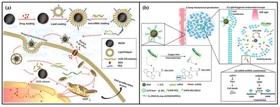 Schematic illustrations of recently reported combination therapies using lipid-coated silica nanoparticles: (a) Development and antitumor mechanism of LHD/miR-375 (reproduced from [102], with permission from Dove Medical Press Limited); (b) iRGD-modified lipid-coated MSNs and light-triggered siPlk1/miR-200c delivery mechanism (reproduced with permission from [103], copyright 2020, American Chemical Society).