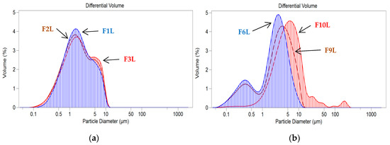 43]. Interestingly, this change did not occur in some of the drug-loaded formulations. DSC curves of SLM with 0.1% of CsA (F7L) and with SPIR (F9L and F10L) still presented the peak characteristic for the bulk stearic acid, only slightly shifted (less than 3 °C) towards a lower temperature. However, in all spray-dried formulations, DSC curves did not show a peak characteristic for the bulk stearic acid. Instead, a broad melting peak, shifted by more than 10 °C towards a lower temperature, was observed. This means that, even if, in the SLM, prepared “de novo” stearic acid retained its original polymorphic form, the spray-drying process each time affected the crystalline structure of this lipid matrix (