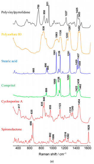 Figure 5a) were not recognized. Since the distribution and release studies did not show clear differences after drying in these formulations, this may indicate that simple univariate imaging does not provide reliable maps of CsA or SPIR on the SLM surface and may be misleading. At this stage of the research, this indicates the need to verify the conclusions obtained on the basis of the Raman maps analysis. Better results would be expected at a higher API concentration or when testing another API with characteristic spectral properties.