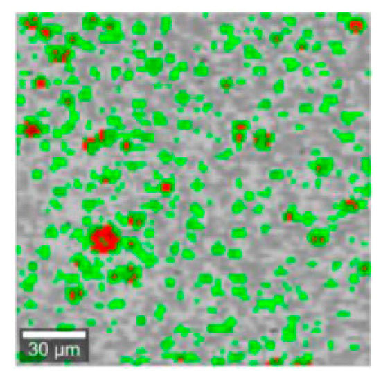 To make the surface of single SLM more visible and to improve the detection of the API, the magnification was changed to 100×, with a spot size of approximately 0.3 μm. When 100× magnification was applied, intense signals from the lipids (blue color on the maps) were obtained, and they clearly assumed spherical shapes of the lipid particles. The green color on the maps originate from polysorbate in liquid or PVP in spray-dried formulations (