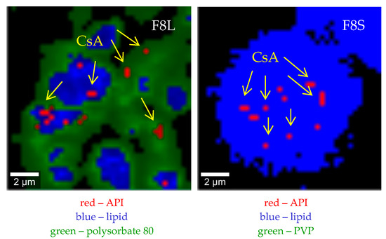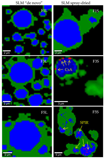 Raman spectroscopy is a useful technique, as it involves no sample preparation and, most importantly, allows measurements in the presence of water. However, at the current stage of our research, it has not brought the expected results, and the attempt to confirm with this technique the localization of the API on the surface of the SLM was unsuccessful. Although both CsA and SPIR were identified on the SLM surface, the dominant components on the Raman maps were lipids and polysorbate or PVP. Discrimination on the spectra of the bands derived from the API and lipids (or other excipients) was impossible, mainly due to the spectral properties of the tested API and their low concentrations in the formulations.
