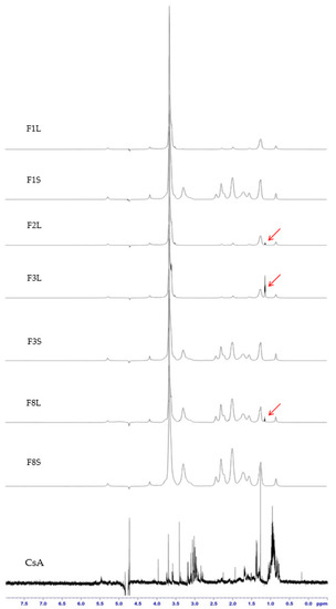 Figure 8). An additional band with the intensity increasing with the increased CsA concentration was identified irrespective of the type of lipid. This line is invisible, however, in the spectra of spray-dried formulations. At the same time, in the mentioned spectra of the dried formulations, there are numerous additional bands in the range of 1.0–3.5 ppm (F1S, F3S and F8S in