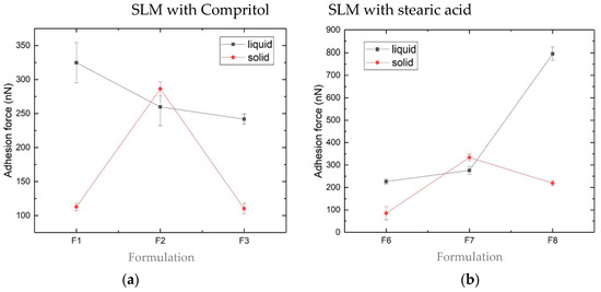 Figure 9a,c), the increased concentrations of CsA and SPIR resulted, respectively, in decreased and increased adhesion strengths. In the formulations with stearic acid, the reverse tendency was seen (