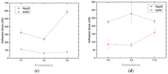 Figure 9b,d). As a rule, smaller adhesion strengths were measured in the spray-dried formulations. Visible differences in the values of the adhesion forces (