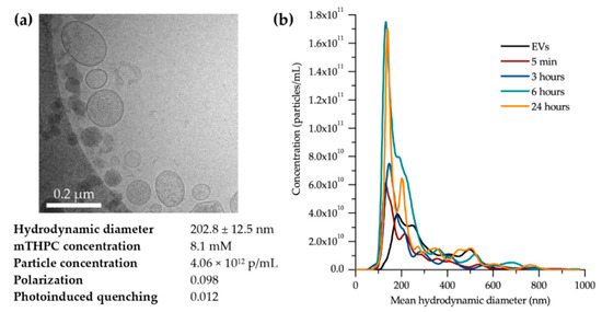 Characteristics of meta-tetra(hydroxyphenyl)chlorin–extracellular vesicles (mTHPC-EVs). (a) Morphology of mTHPC-EVs determined by cryo-transmission electronic microscopy (TEM); below the scan, the NanoSight photophysical properties of mTHPC-EVs along with the physico-chemical and photophysical characteristics of mTHPC-EVs. (b) Incubation kinetics of mTHPC-EVs in the presence of 20% exo-free murine plasma determined by NanoSight.