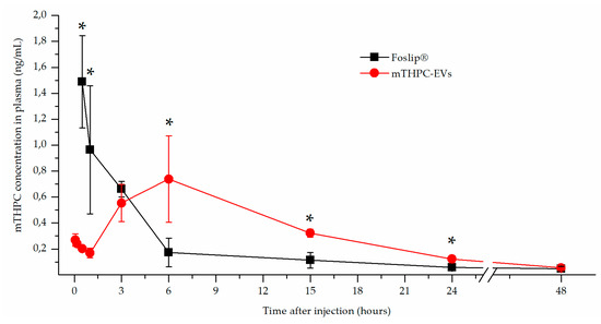 mTHPC concentration in plasma in function of time after injection. Intravenous injections of mTHPC-EVs or Foslip® in human colon (HT-29) tumor-bearing mice were realized with 0.30 mg/kg of mTHPC. * p < 0.05.