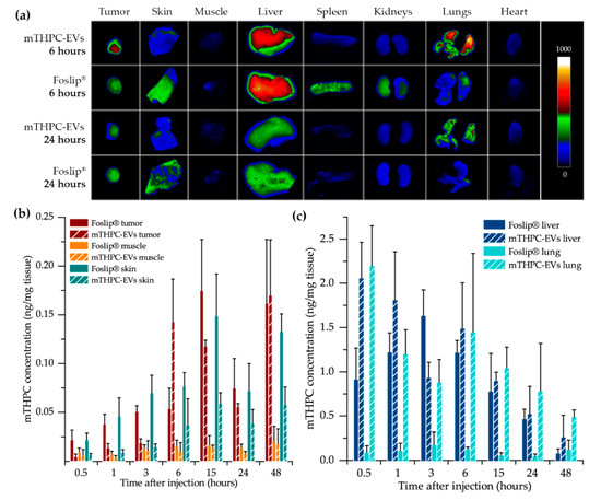 Kinetics of mTHPC biodistribution in selected organs. (a) Fluorescence imaging was obtained 6 and 24 h after injection of Foslip® or mTHPC-EVs. The concentration of mTHPC in selected tissues, obtained after chemical extraction, is expressed in function of time after intravenous injection: (b) tumor, skin and muscle; (c) liver and lungs.