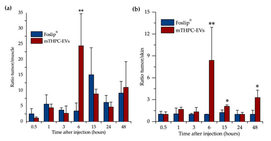 (a) Tumor/muscle and (b) tumor/skin ratio after Foslip® and mTHPC-EV injection. * p < 0.05; ** p < 0.01.
