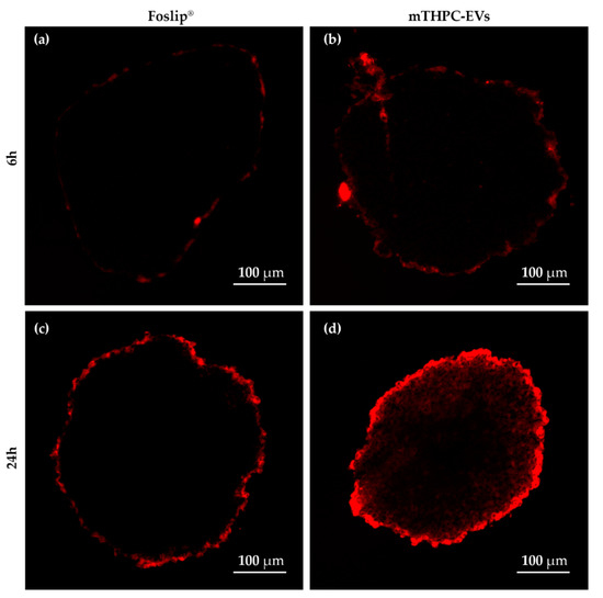 Fluorescence microscopy was used to evaluate mTHPC diffusion inside 3D multicellular spheroids. The fluorescence of liposomal mTHPC was confined to the spheroid periphery irrespective of incubation time (Figure 5a,c). In contrast, while similar peripheral localization was observed with mTHPC-EVs after 6 h of incubation, strong fluorescence deeper inside the spheroid core (reaching spheroid core) was detected after 24 h incubation (Figure 5b,d).