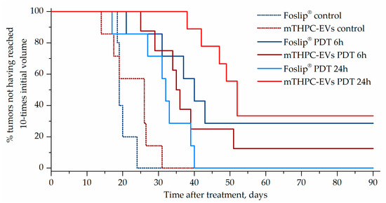 Kaplan–Meier plots of tumor response showed the best antitumor effect in animals after mTHPC-EVs/PDT at a 24 h DLI (33% cured mice), while at a 6h DLI, only 12% of mice were cured. The best effect in Foslip®/PDT group was observed at 6 h DLI providing 27% cured animals (Figure 6).