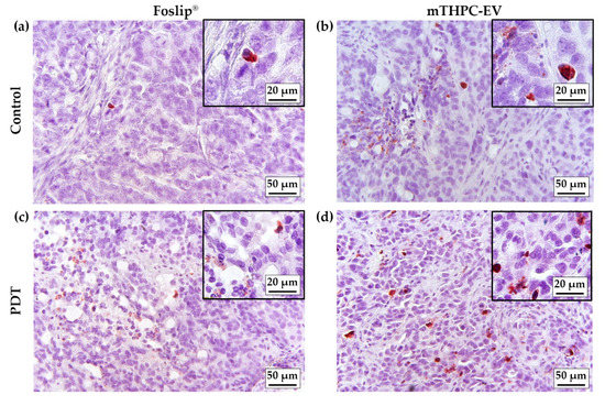 Apoptotic cells were assessed by IHC staining of active caspase-3. Only a few cells were stained in control samples (Figure 7a,b; Table 3). Maximal staining was obtained in the mTHPC-EVs/PDT group (3.5%) and was found significantly different (p < 0.01) from Foslip®/PDT (1.56%) (Table 3). A careful examination of immunostaining images showed an increase in apoptotic bodies’ numbers in tissue sections in the irradiated tumor (Figure 7c,d) with typical nuclear morphological changes.