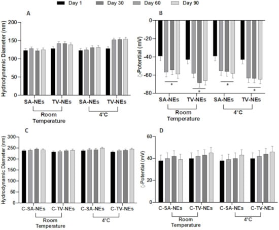 Physical stability studies in terms of hydrodynamic diameter and ζ-potential variations of uncoated (SA- and TV-NEs) (A,B) and of chitosan coated nanoemulsions (C-SA- and C-TV-NEs (C,D) up to 90 days at two different storage temperatures (* = p < 0.05 when compared with day 1).